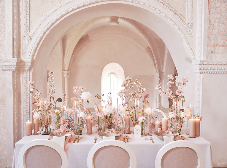Pour le secteur de la fleuristerie, les mariages constituent un pôle d’activité important. Il en va de même pour Karin Mani. Avant que la saison ne démarre véritablement, elle a imaginé une vision onirique dans des tons poudrés et rosés, en harmonie avec le cadre historique.