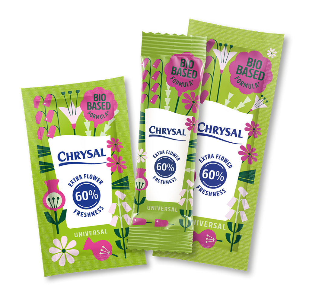 Mit dem neuen Chrysal Blumenfrisch Papier wurde ein weiterer Schritt in Richtung nachhaltiger Verpackungen gemacht. Das Tütchen besteht aus ECF-Zellstoff und ist biobasiert beschichtet. Dadurch kann die Verpackung in den herkömmlichen Papiermüll geworfen werden. Das Tütchen enthält das bewährte Extra Frisch Pulver, das sich leicht und klar ins Wasser mischen lässt, geruchlos ist und alle notwendigen Zutaten für die volle Entwicklung von Knospen sowie Blüten liefert.